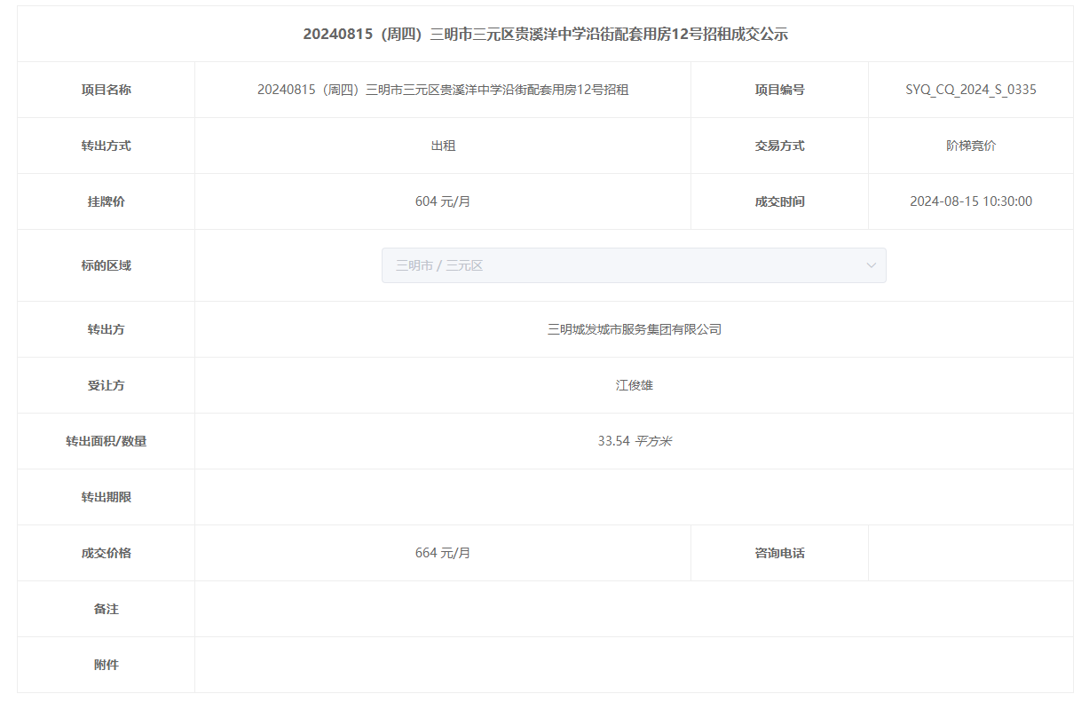 20240815(周四)三明市三元区贵溪洋中学沿街配套用房12号招租成交公示
