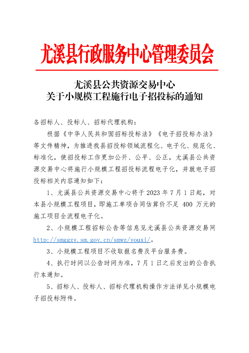 尤溪县公共资源交易中心关于小规模工程施行电子招投标的通知