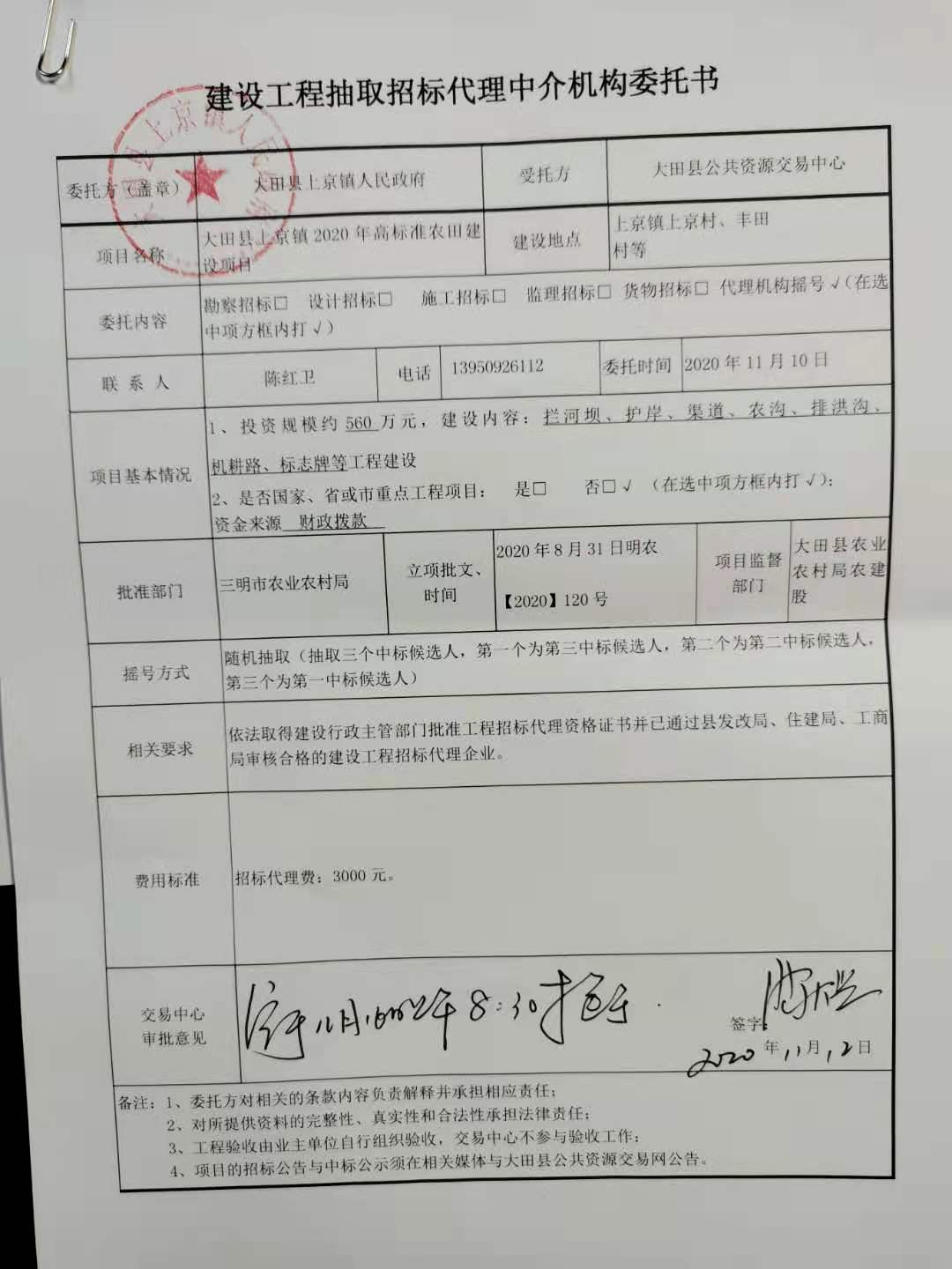 大田县上京镇2020年高标准农田建设项目摇号公告