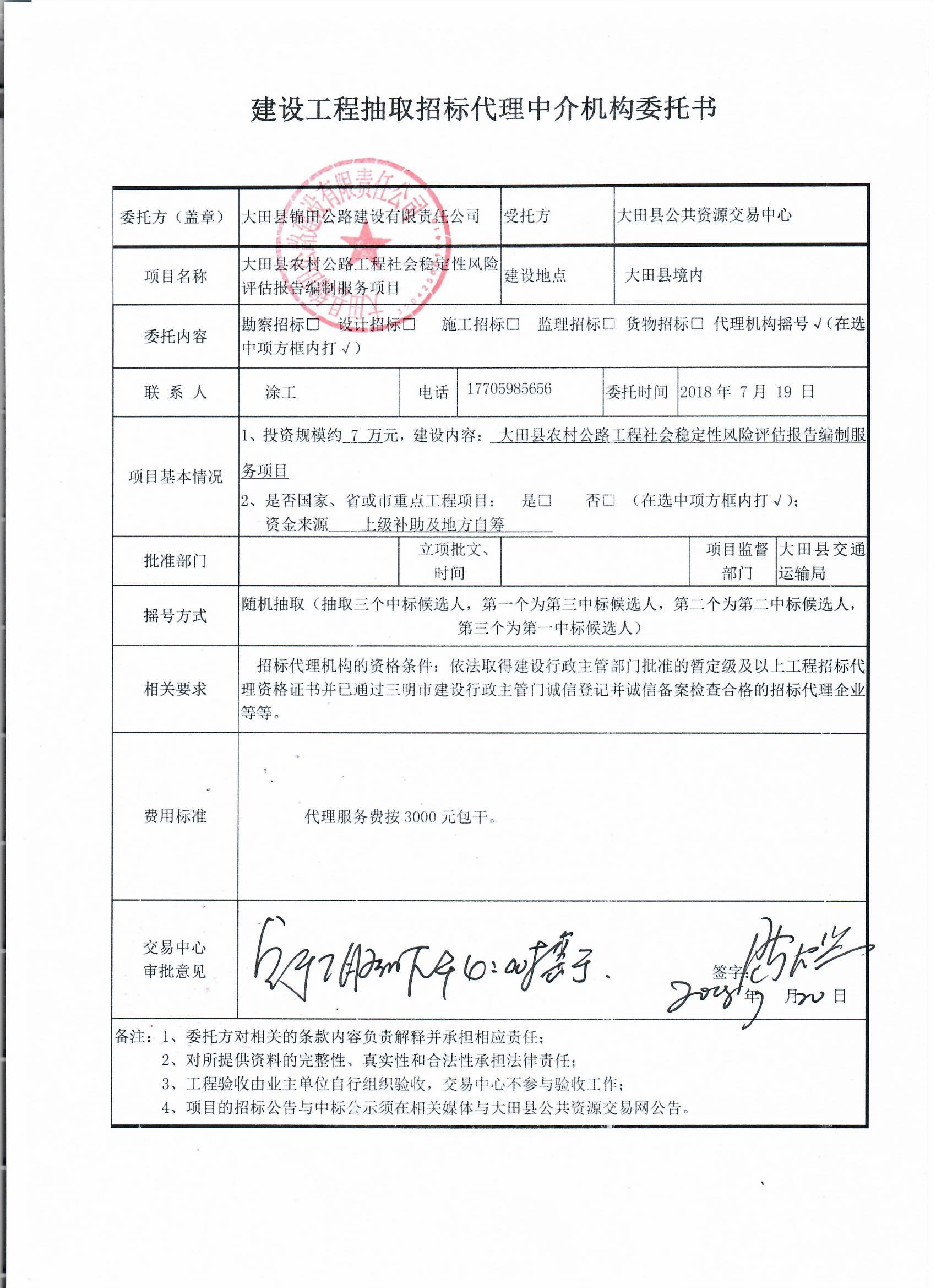 大田县农村公路工程社会稳定性风险评估报告编制服务项目摇号公告