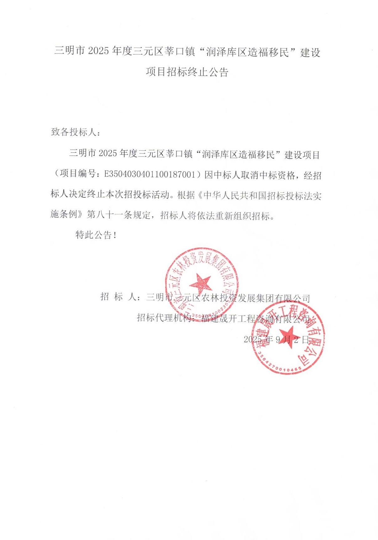 三明市2025年度三元区莘口镇“润泽库区造福移民”建设项目(项目编号:E3504030401100187001)因中标人取消中标资格,经招标人决定终止本次招投标活动。根据《中华人民共和国招标投标法实施条例》第八十一条规定,招标人将依法重新组织招标。